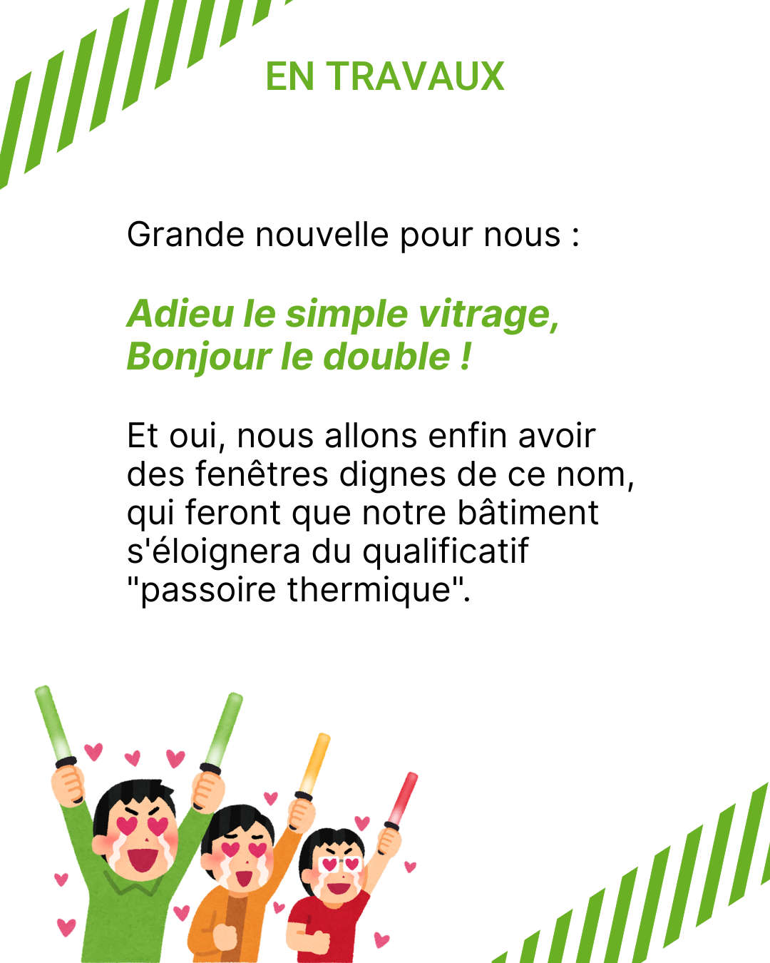Ces travaux nécessitent une belle organisation de notre côté mais nous avons la chance d’avoir des Résident·e·s en or qui comprennent la nécessité que notre bâtiment s’éloigne du qualificatif “Passoire thermique” et ont conscience du confort qu’ils vont gagner dès cet été puis cet hiver.